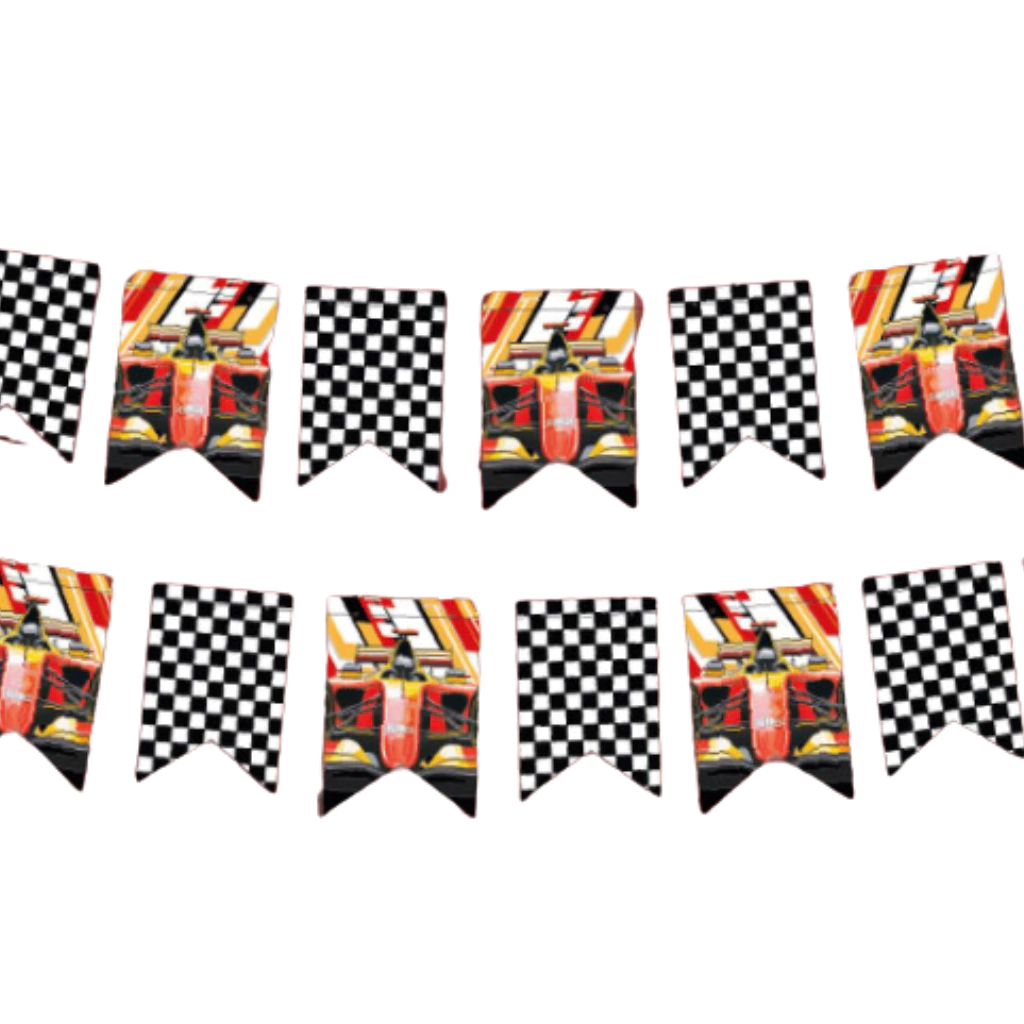 ¡Dale un toque especial a tus fiestas con este banderín divino! Banderín Feliz cumple deAutos de Carrera 1 unidad Material: Cartón Medidas: 18x12 cada banderín aprox.