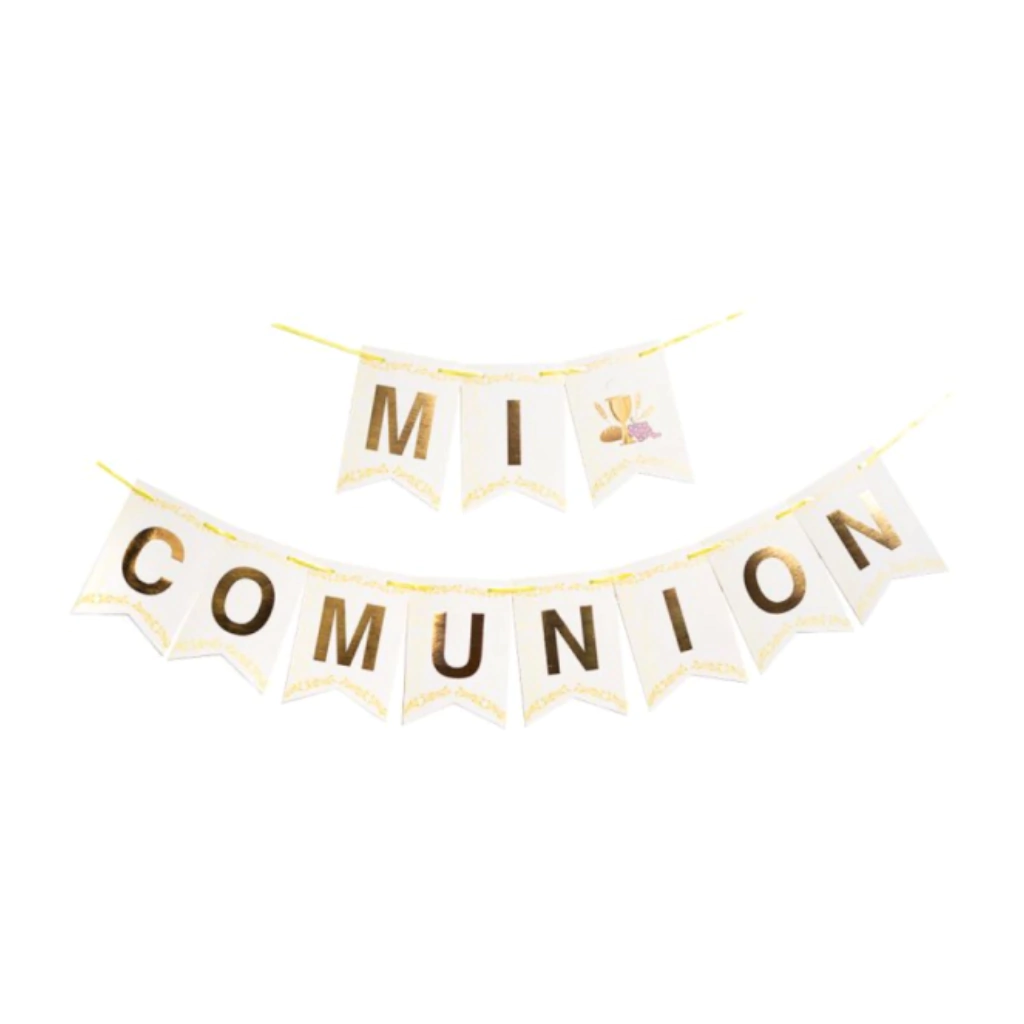 Banderín Mi Comunión color blanco con letras y detalles en dorado