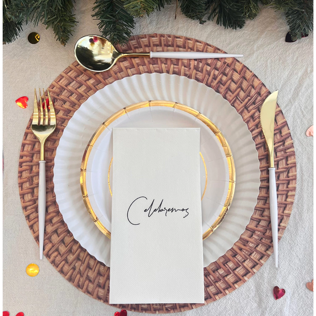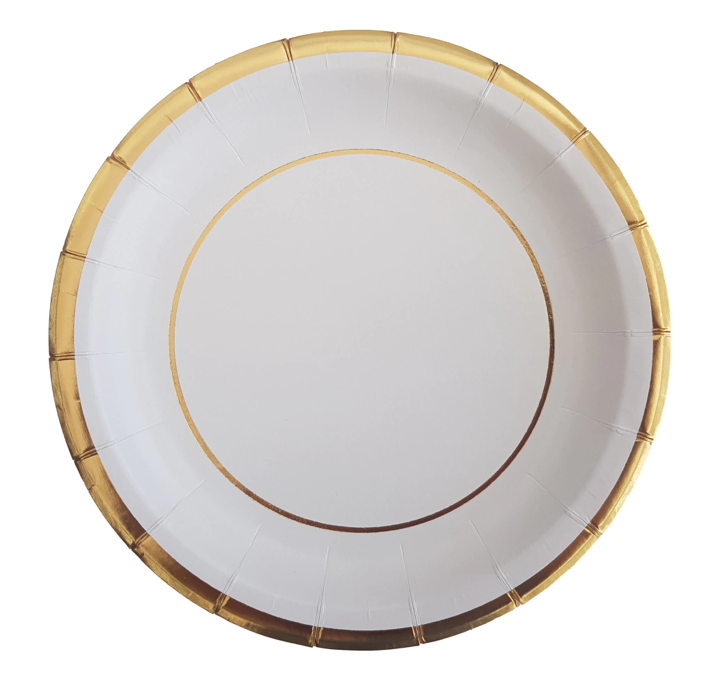 Plato blanco con borde dorado, ideales para vestir tu mesa