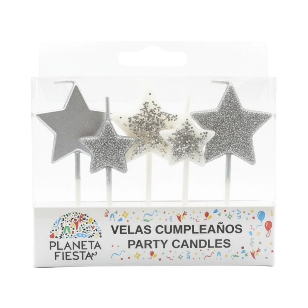 Set Velas Estrellas – Plateado y Dorado Sumá brillo y estilo a tus celebraciones con este set de velas en forma de estrella. Viene en tonos plateado y dorado, ideales para tortas, mesas dulces y festejos especiales. Su diseño elegante y festivo combina perfecto con cualquier temática, aportando un detalle que realza la decoración al instante. Un toque brillante para hacer tus mejores deseos ✨⭐