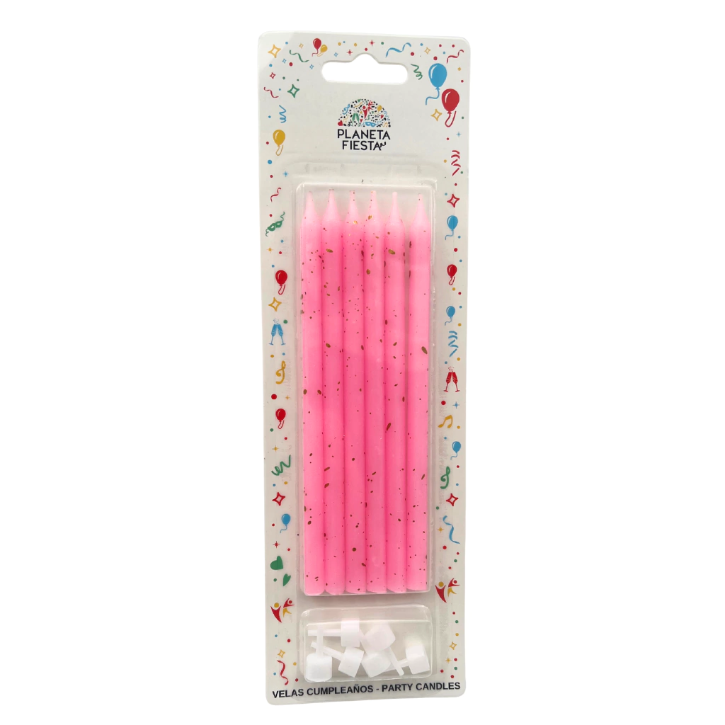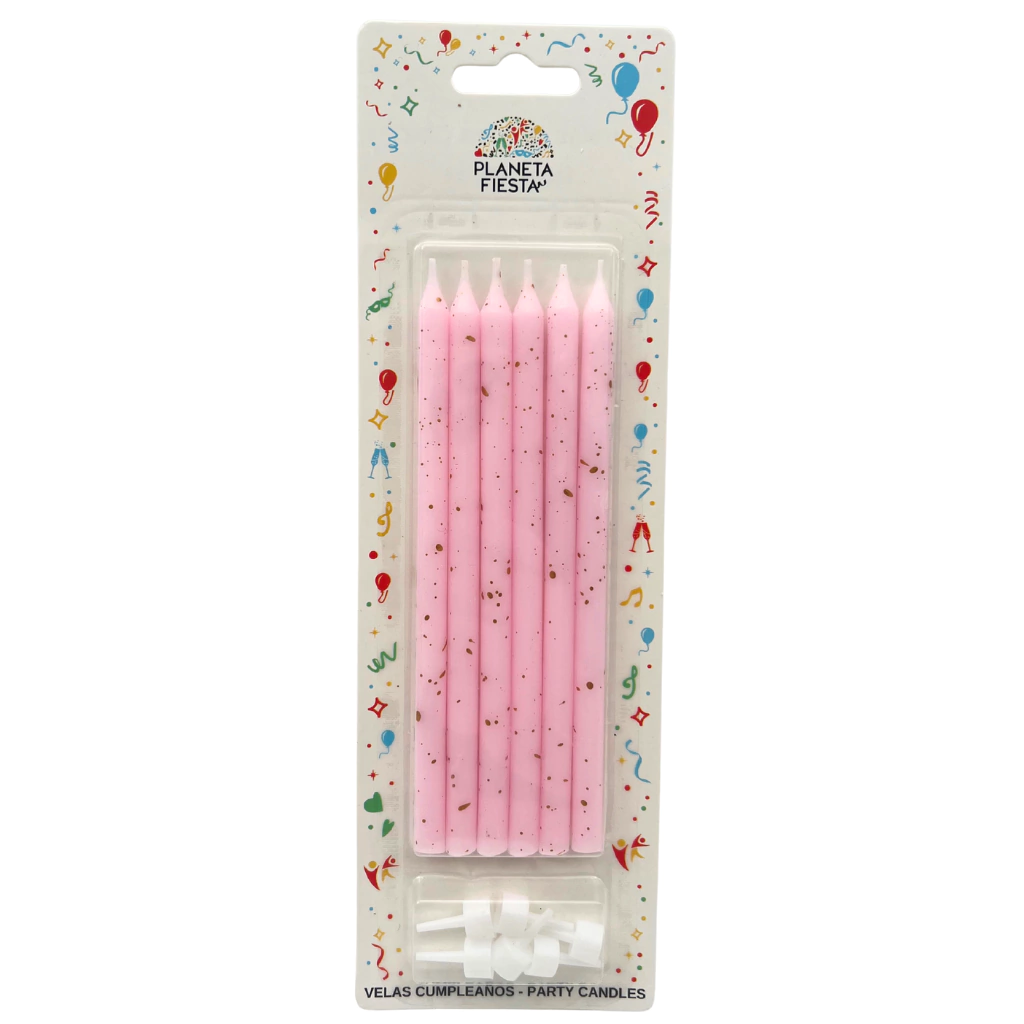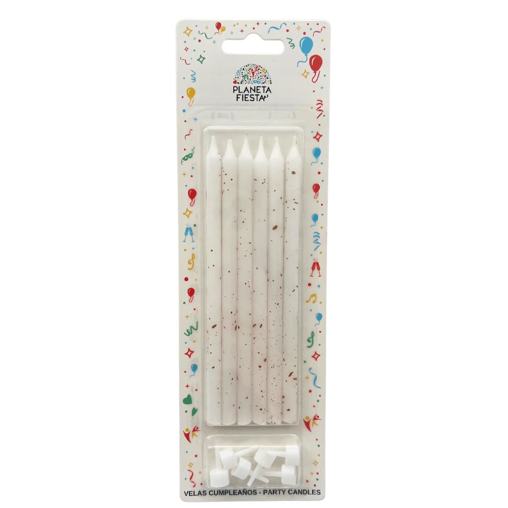 Elegí un detalle moderno y distinguido para tu torta con nuestras Velas Golden Chic. Vienen en un set de 6 unidades e incluyen portavelas para colocarlas de forma práctica y segura.