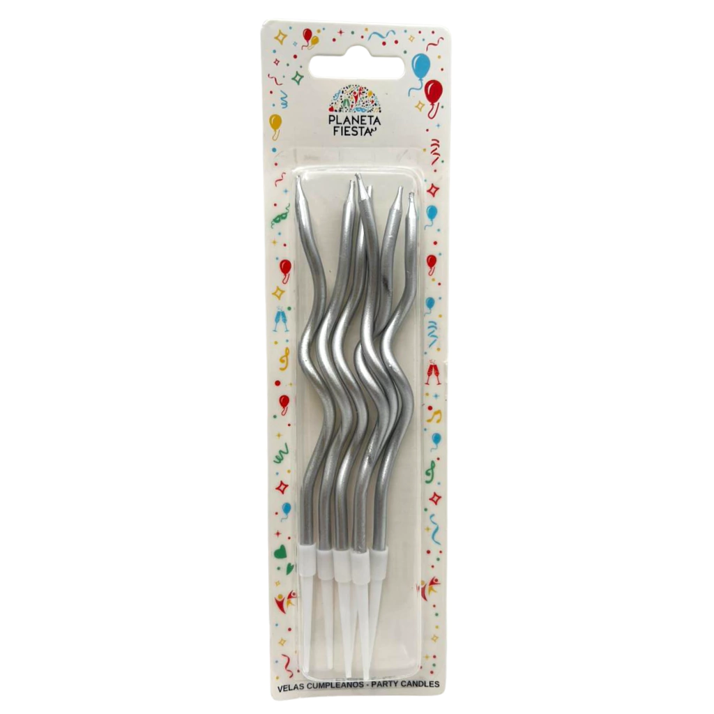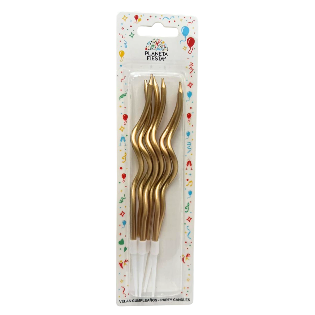 VELAS ONDAS METALIZADAS + PORTAVELAS x6 (12 cm de alto) Dale un toque moderno y elegante a tu torta con nuestras Velas Ondas Metalizadas. Vienen en un set de 6 unidades e incluyen portavelas para que las puedas colocar de forma fácil y segura. Con su diseño ondulado y acabado metalizado, son ideales para cumpleaños, celebraciones y mesas especiales. Perfectas para sumar brillo sin recargar la decoración. ¡Un detalle simple que hace la diferencia!